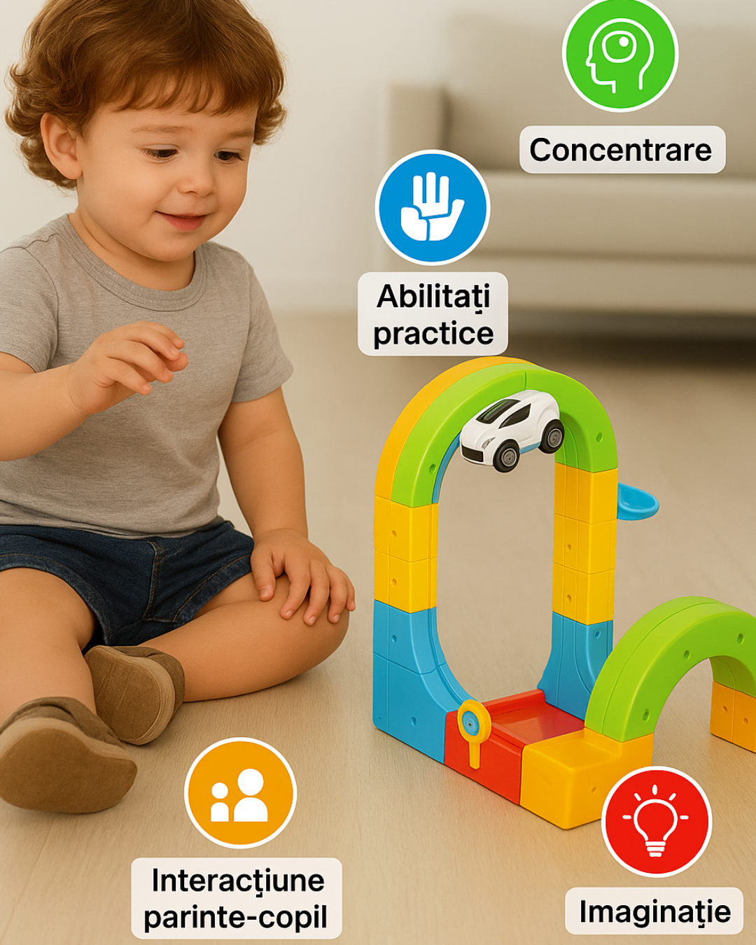 O jucărie care nu doar distrează, ci și dezvoltă: copiii își antrenează imaginația, coordonarea și gândirea logică în timp ce construiesc trasee unice.